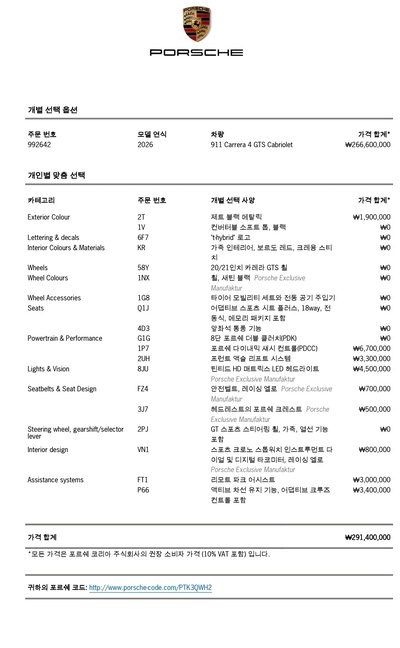 이번 승계 대상 차량은 2026년식 포르쉐 911(992) 카레라 4 GTS 카브리올레 트림으로, 고급스러운 검정색 외장과 강력한 가솔린 엔진, 부드러운 오토 기어가 조화를 이룬다. 오픈 에어링의 자유로움과 포르쉐 특유의 정교하고 짜릿한 드라이빙 성능을 동시에 만끽할 수 있는 매력적인 모델로 평가받는다. 신차 가격은 2억 6,517만 원에 달하며, 연비는 7.9km/L(5등급)이다.