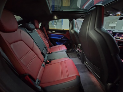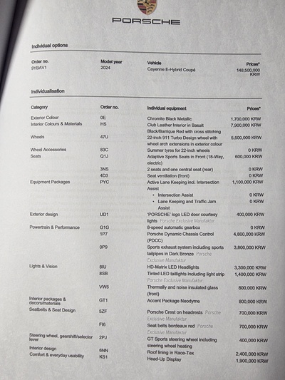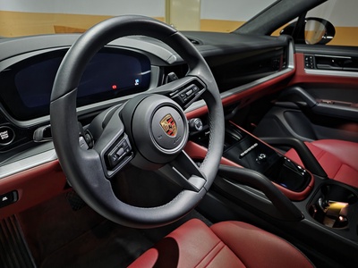 이번에 리스 승계로 나온 차량은 '2024 포르쉐 카이엔(3세대) 3.0 V6 E-Hybrid Coupe' 모델로, 크로마이트 블랙 메탈릭(Chromite Black Metallic) 외장 색상에 블랙/바리크 레드(Black / Barrique Red) 클럽 레더 인테리어가 조화를 이루어 압도적인 존재감을 자랑한다. 신차가 기준 총 1억 8,770만원에 달하는 풀옵션 차량으로, 일반 모델 대비 차별화된 주행 성능과 고급감을 선사한다.