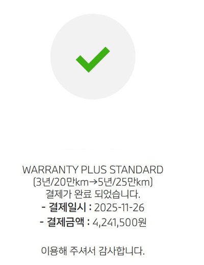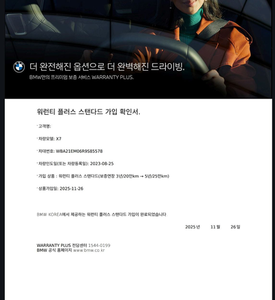 차량 상태는 단순 앞뒤 범퍼 교환 이력이 있으나, 이는 기능상 문제 없는 경미한 수준으로 알려졌다. 무엇보다 주목할 점은 고가의 수입차 유지 보수 비용에 대한 부담을 크게 덜어줄 수 있는 워런티가 5년/25만km로 연장되어 있다는 사실이다. 워런티 가입 사진도 함께 게시되어 신뢰도를 높이고 있다.